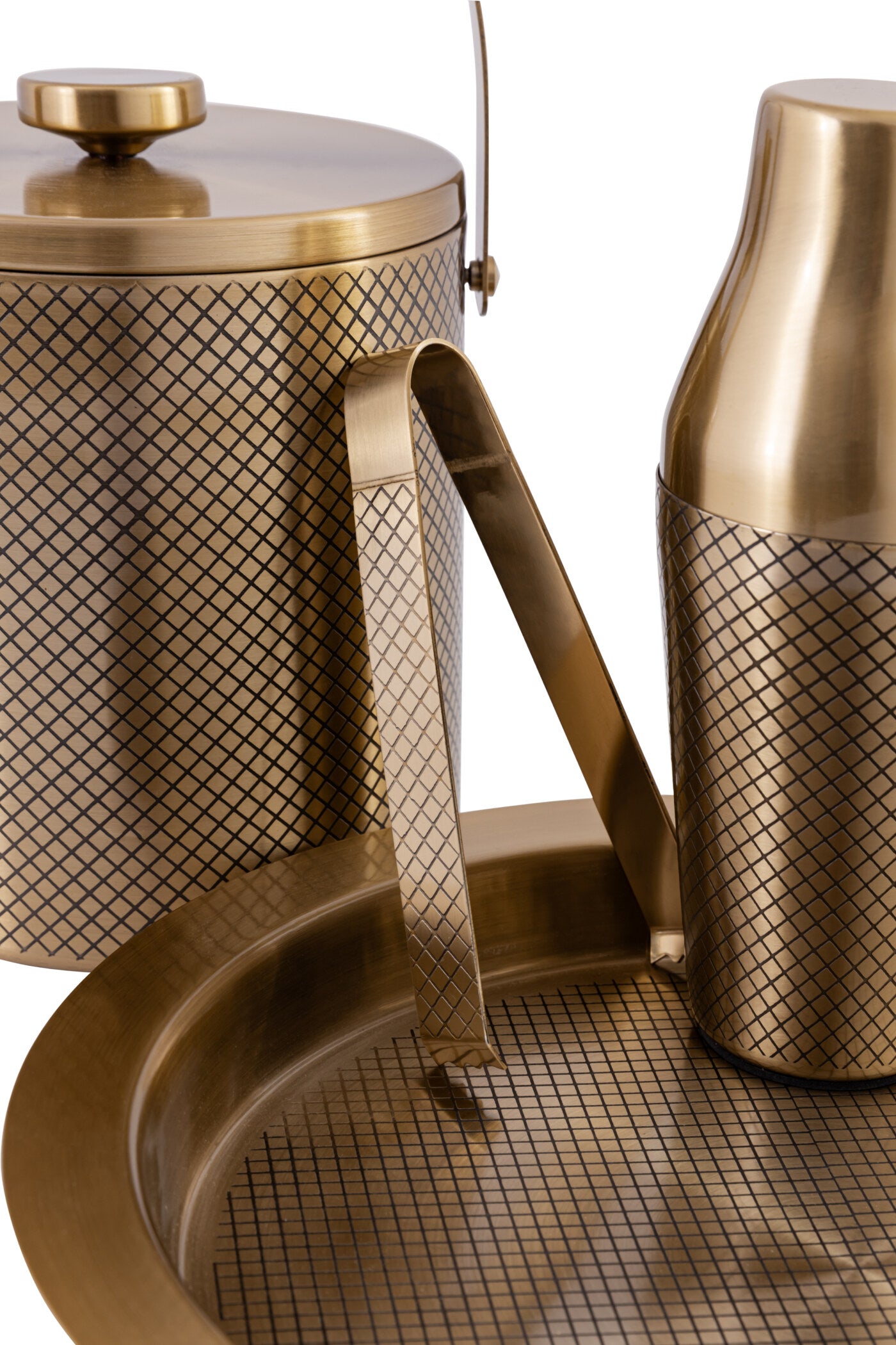 Kaniry’s new range of Ice Box Cocktail Shaker sets are perfect for all occasions and celebrations. The abstract art on the metal elevates the solid antique gold base, the contrast solid gold lids further defines the design. The set has gold colored plating with a black powder coating, its a 4 pcs set including an ice box, tongs, cocktail shaker and tray. The ice box is double walled insullation and vaccum lid keeps ice frozen longer with no condensation.