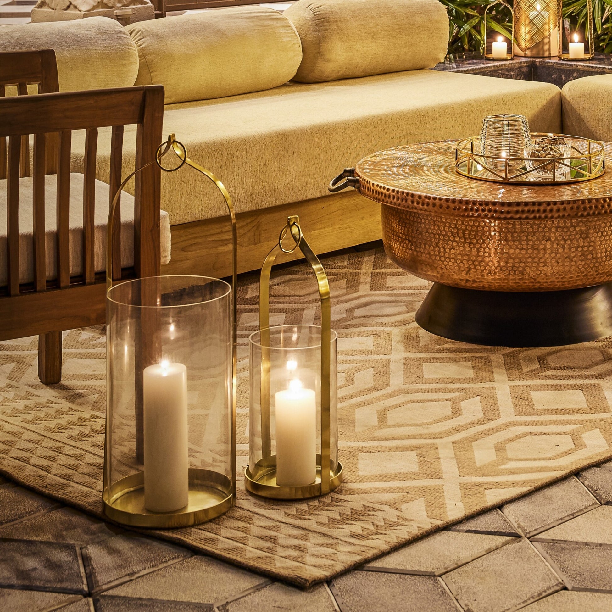 A modern twist to the temple dome shape defines this Lantern. The clean simple glass body and metal frame in gold resonates to its style. Lanterns are auspicous and decorative both and the Temple Arch collection highlights the same.